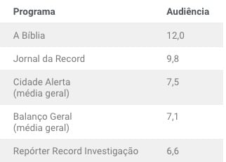 Além da novela a Bíblia, confira quais foram as outras programações mais assistias na Record no último dia de glória do canal, quinta (17).