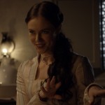 Lívia logo percebe o jogo da morena e responde: “No mesmo dia que conheci o senhor Roberto, ele veio nos cumprimentar no coche do seu Ariel. A senhorita estava junto do Conde Felipe, talvez não se lembre. Eu estava com a mãe da Anita e uma amiga dela”.