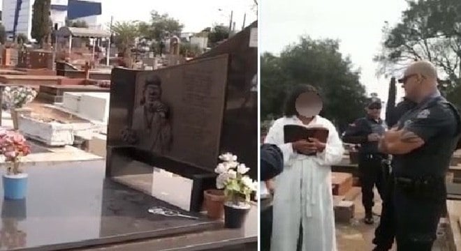 Mulher é flagrada depreciando túmulo de cantor sertanejo José Rico e acaba sendo presa pela polícia.