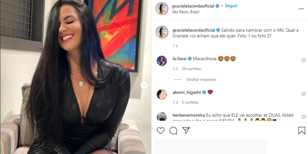 Porém, Graciele Lacerda estava confusa de qual postura aderir no dia em questão. Ela publicou uma imagem aos risos e outra mais séria. Na legenda, ela pediu a opinião dos internautas. “Saindo para namorar com o Mô. Qual a Graciele vcs acham que ele quer. Foto 1 ou foto 2?”, escreveu.