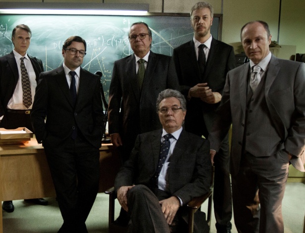 Winston Fritsch (Fernando Eiras), Gustavo Franco (Emilio Orciollo Netto), Pedro Malan (Tato Gabus Mendes), Fernando Henrique Cardoso (Norival Rizzo, sentado), Persio Arida (Guilherme Weber) e Andre Lara Resende (Wladimir Candini) (Foto: Reprodução)