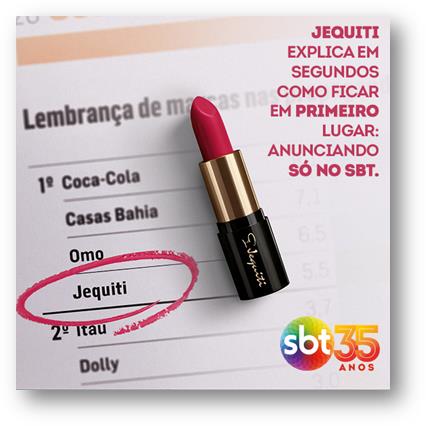 Analisando a evolução da pesquisa, a Jequiti estava na segunda posição em fevereiro deste ano, ultrapassando agora marcas como Itáu, Havaianas e Skol, por exemplo. Para comemorar o resultado, a área de Marketing do SBT lança este mês anúncio na mídia com a seguinte frase: “Jequiti explica em segundos como ficar em primeiro lugar: anunciando só no SBT!”.
