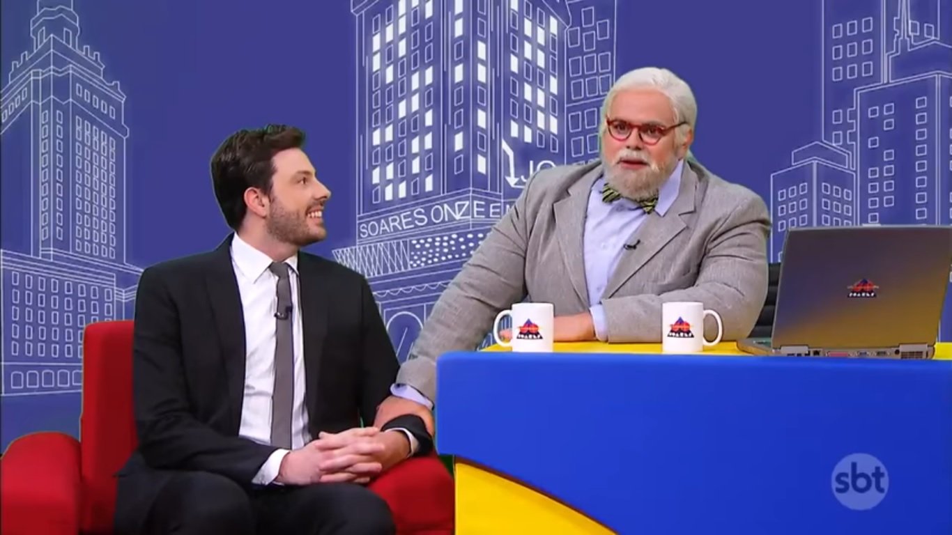 É que Danilo aproveitou a entrevista com Márvio Lúcio, o Carioca do programa “Pânico”, e recriou todo o cenário do extinto “Jô Soares Onze e Meia” com ele imitando o gordinho da TV Globo.