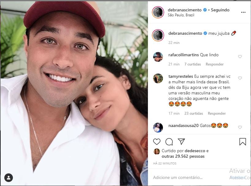 Por meio do Instagram, a atriz da TV Globo, compartilhou o clique ao lado do irmão. “Meu jujuba”, disse ela na legenda. Os fãs não deixaram a foto passar despercebida. “Eu sempre achei vc a mulher mais linda desse Brasil, dês da Biju agora ver que vc tem uma versão masculina meu coração não aguenta não gente”, “Mds, iguais, lindos”, “Idênticos”, “Mais é uma cópia”, “São gêmeos né”, “Mais é uma cópia”, comentaram os fãs de Débora Nascimento.