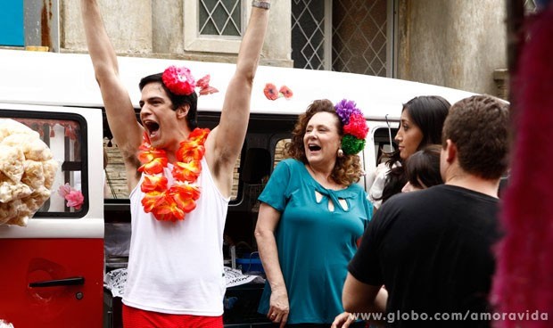 E lá se vai o ex-presidente do San Magno, vestido em um shortinho, com o colar pendurado no pescoço, a flor no cabelo e óculos escuros. Carlito (Anderson Di Rizzi) vê a cena e não perde a piada. “Ô, dona Márcia! Todo mundo que mora na sua casa vira periguete”, provoca.