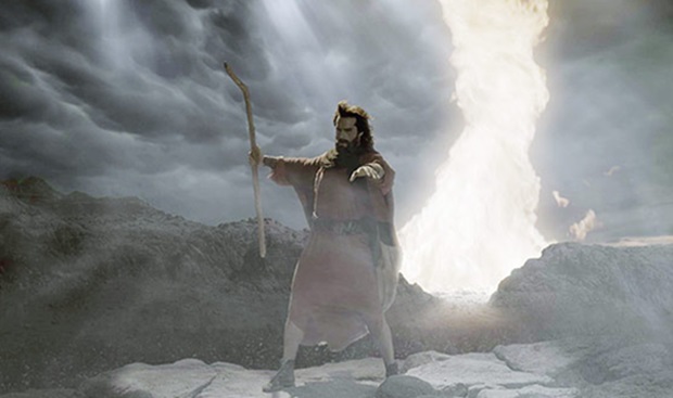 Moisés (Guilherme Winter) encara as águas do Mar Vermelho
