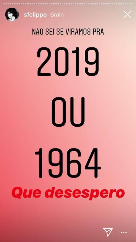A atriz Samara Felippo questionou em um storie do Instagram se o Brasil migrará no ano que vem para 2019 ou para 1964. “Que desespero”, escreveu.