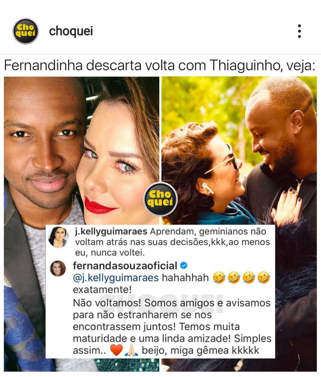 Em resposta a uma internauta que saiu em sua defesa, ela contou que não volta para o ex e de quebra brincou com o motivo. “Aprendam, geminianos não voltam atrás nas suas decisões, kkk, ao menos eu, nunca voltei”. Em resposta Fernanda Souza reafirmou o dito pela internauta: “Hahahaha exatamente! Não voltamos! Somos amigos e avisamos para não estranharem se nos encontrassem juntos! Temos muita maturidade e uma linda amizade! Simples assim.. beijo, miga gêmea”.