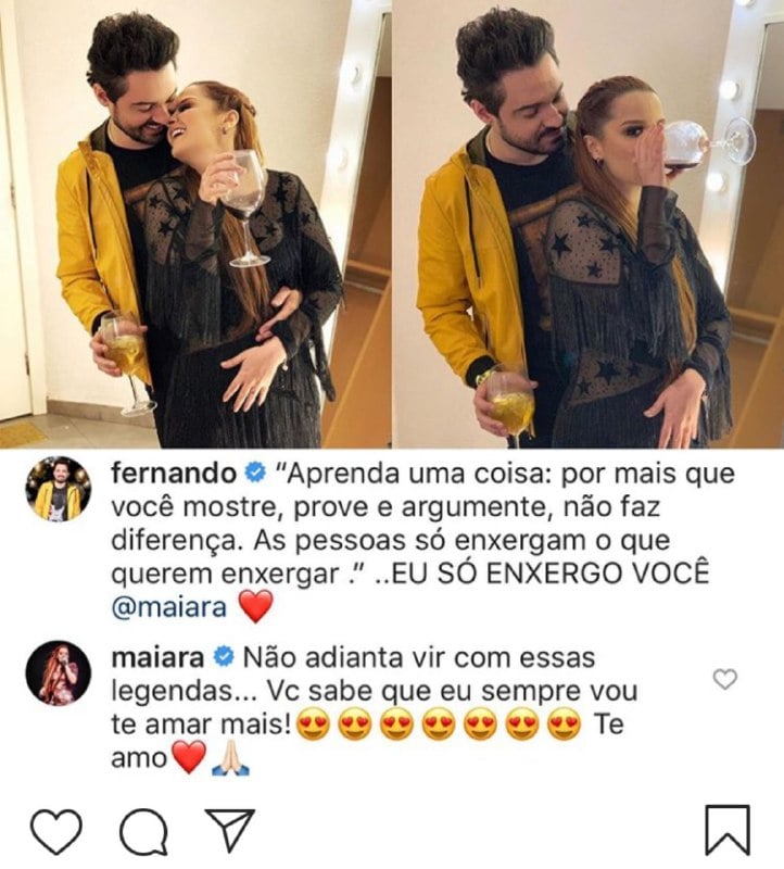 “Aprenda uma coisa por mais que você mostre, prove e argumente, não faz diferença. As pessoas só enxergam o que querem enxergar. Eu só enxergo você Maiara”, escreveu o cantor. Na parte destinada aos comentários, a artista fez questão de rebater a declaração de amor de Fernando e em sua resposta os dois ‘protagonizaram a briga’ para saber quem ama mais.