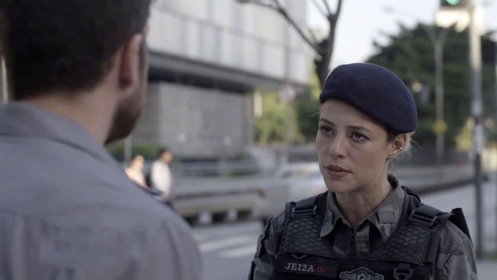 Jeiza vai manter o seu jeito firme e a sua postura, pedindo mais uma vez os documentos do rapaz e desse vez o ameaçando de ser preso caso não cumpra a ordem dada. “Seus documentos, senhor! Ou vou ter que lhe dar voz de prisão!“.
