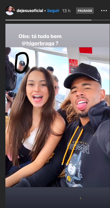 O jogador compartilhou em seu stories do Instagram uma foto com Fernanda Queiroz, na “legenda” ele brinca com um amigo que está no fundo da imagem. Gabriel Jesus tentou descontrair e desviar a atenção da nova namorada para a expressão do colega no fundo, mas a tentativa não deu muito certo.