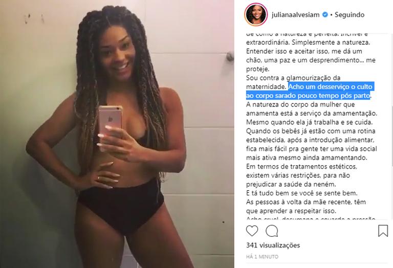 A atriz Juliana Alves fez um desabafo nas redes sociais, nesta segunda-feira (20). Após onze meses do nascimento Yolanda, sua filha, a global resolveu criticar a ditadura do corpo perfeito após a gravidez.