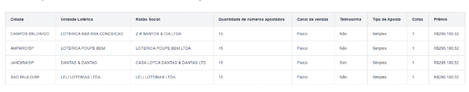 Quatro apostas acertaram os 15 números. Confira a seguir:
