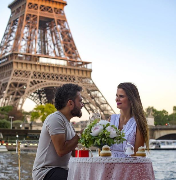 “Ao pé da Torre Eiffel e às margens do Rio Sena, num cenário digno de filme romântico , renovamos os votos de casamento!!!! E não acreditei que ela fez isso, com a ajuda de nossas filhas e da turma do @picnicemparisfleurdujour minha amada preparou uma surpresa para mim, Logo eu, que sou cheio de fazer uma….”, iniciou ele