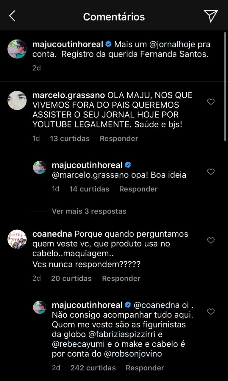 “Maju Coutinho se superou hoje”, disse uma, acrescentando emojis de palminhas para a jornalista. “Mais linda do que nunca”, comentou um outro telespectador. “Nada abala essa mulher”, disse ainda mais uma fã.