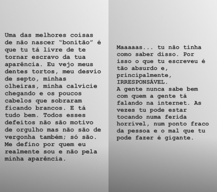 O ocorrido se deu início quando ele abriu uma enquete onde uma pessoa publicou um comentário afirmando que ele precisava “arrumar os dentes”. Na sequência, ele publicou um stories em resposta: “Uma das melhores coisas de não nascer “bonitão” é que tu tá livre de se tornar escravo da tua aparência”, começou ele, que prosseguiu: