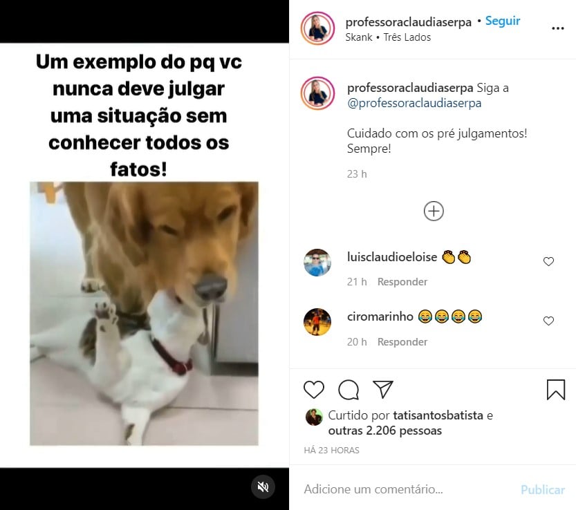 Nos stories, ela surpreendeu ao colocar o vídeo de um cachorro carregando um gatinho, com uma surpresa no final, dando a entender que não devemos julgar um ato por antecipação e sempre tentar saber sobre os dois lados o que realmente acabou acontecendo.