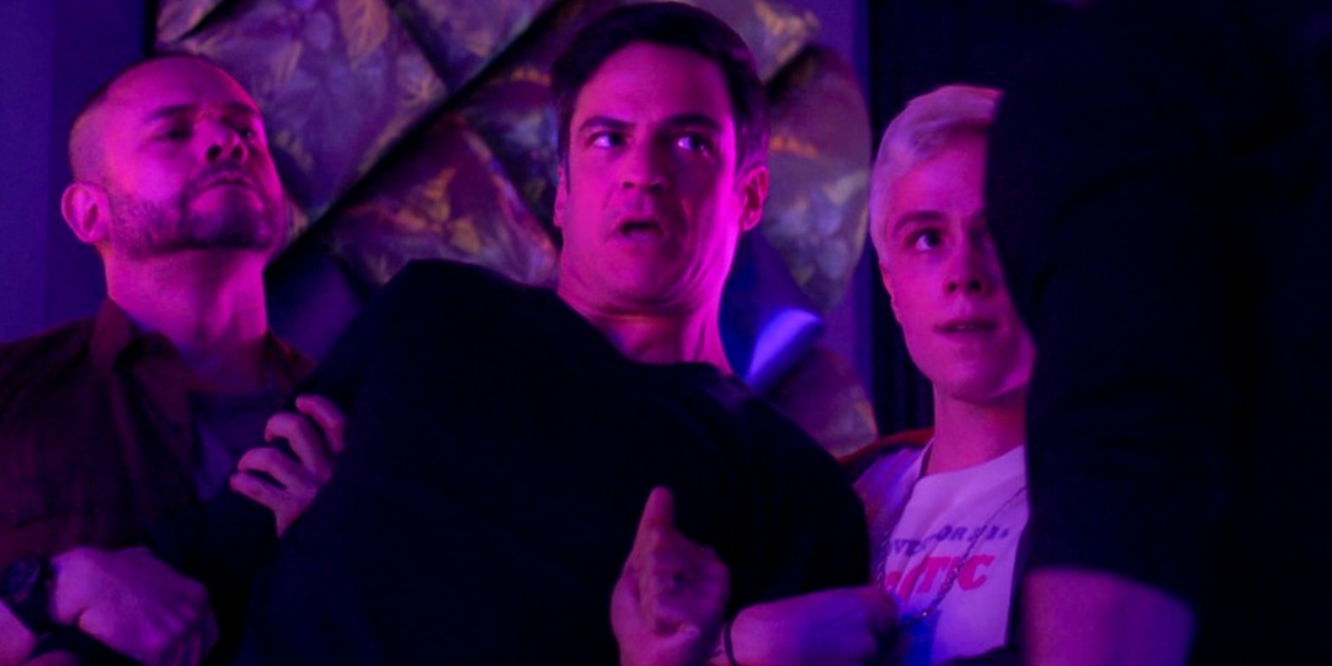 — Larga meu filho, canalha! — Gritará o médico antes de dar um murro no irmão de Neném (Vladimir Brichta).