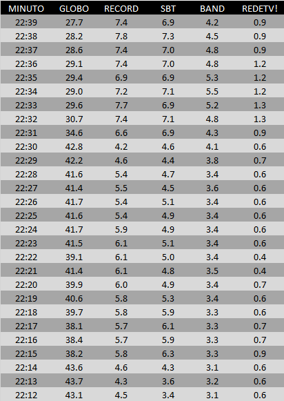 Real Time – SP / Confira a audiência minuto a minuto das 16h ás 22h39