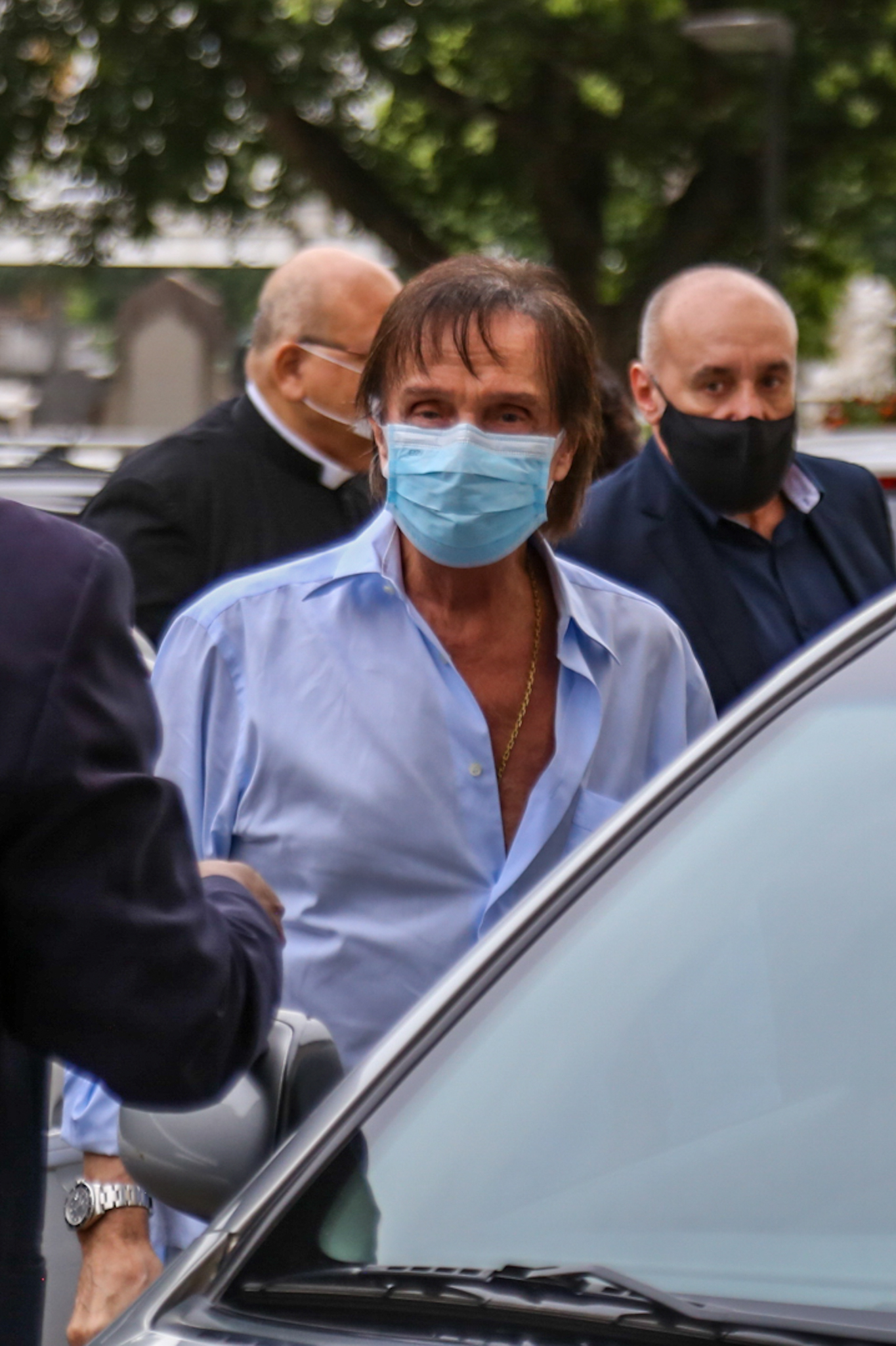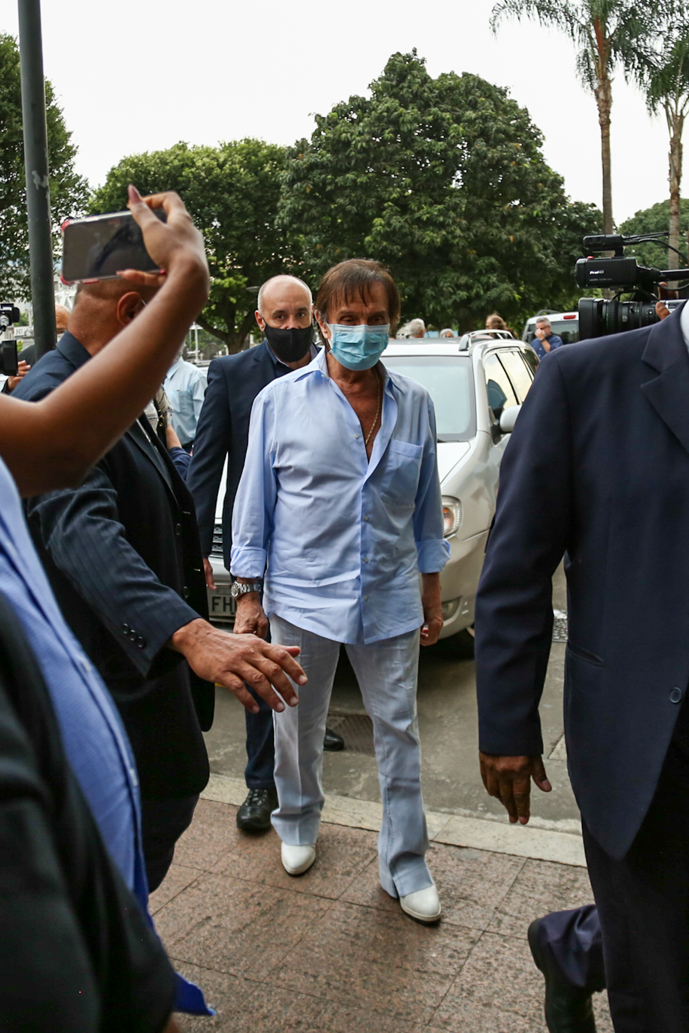 Roberto Carlos foi fotografado ao chegar ao local usando máscara de proteção no rosto contra a Covid-19 e se mostrando abalado com a perda do cantor.