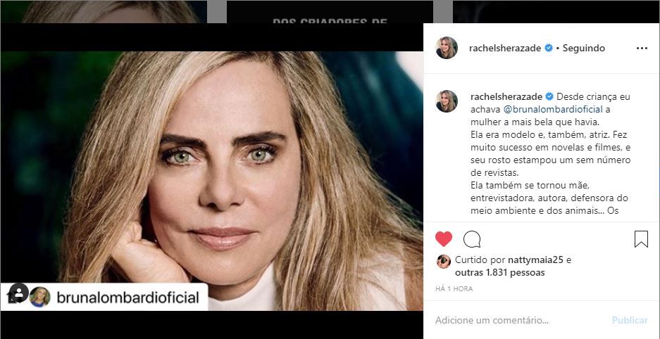 Por meio do Instagram, ela respostou uma foto da atriz e falou do quanto a admira. “Desde criança eu achava @brunalombardioficial a mulher a mais bela que havia. Ela era modelo e, também, atriz. Fez muito sucesso em novelas e filmes, e seu rosto estampou um sem número de revistas”, começou a jornalista.