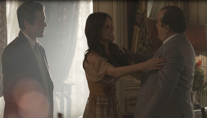 A filha quer conversar com o pai sobre o casamento e ele aproveita para sair do quarto. “Meu pai. Eu e Vicente queremos conversar com o senhor sobre a festa do casamento.” O fazendeiro dá uma desculpa para sair dalí. “Ótimo. Passei muito tempo dentro deste quarto. Vamos descer para o café do hotel.”